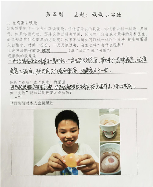 科学学科的一份活动性暑假作业让我记忆犹新。作业分为三个部分,观察、实验与思考。第一周的任务是完成自然笔记,后面三周属于观察部分,第五周、第六周属于实验部分,第七周则属于思考。其实这次做作业的过程,像极了科学探究过程。在这个过程中,我先花大量时间发现感兴趣的现象,再对此现象进行观察猜测,接着再去做实验验证。最后,不论实验成功与否,我们都会进行思考、总结。这份活动性作业与以往试卷习题不同,似乎可以轻松搞定,但要完成它需要我们认认真真参与,实实在在做实验,老老实实做记录,花的时间却远大于完成几张试卷。