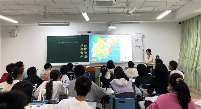 2021年10月22日,外文组开展了新教师公开课展示。授课教师为西班牙语老师廖晓芳,授课内容为天气预报。教务处副主任王敏、初中外文组教研组长王凝迟、初高中外文组老师参与听课。