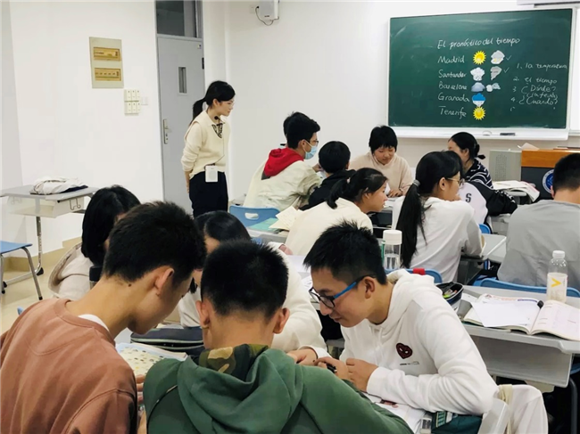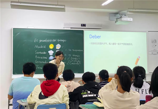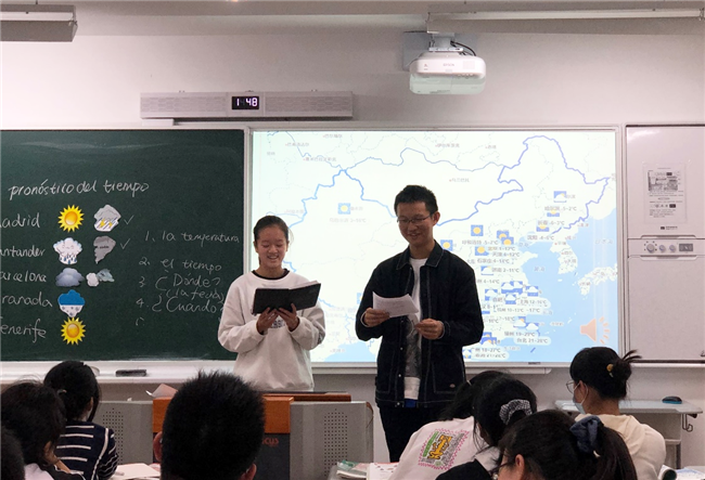 紧接着,各小组合作讨论,用西班牙语播报明日中国或者西班牙3座城市的天气。伴随着熟悉的天气预报背景音乐,小小预报员们仪态大方,表达流畅。尤其是第4组同学别出心裁,扮演校园电视台主持人,用西班牙语播报中国天气预报,将课堂知识与生活实际充分结合。