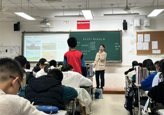 课堂上,朱灿老师运用了大量的图片和视频材料让学生直观感受到美国农场大规模、机械化的生产方式。学生在探究活动中讨论热烈,积极发言,非常乐于分享自己对问题的看法,课堂气氛活跃。