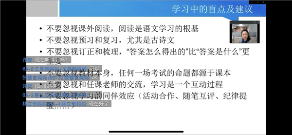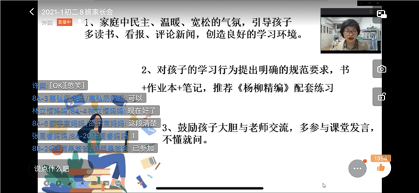 会议的重头戏是班主任结合班级情况做总体分析。为了进一步促进交流,他们为此次直播做了充分的准备工作。会议中,大家以饱满的热情和认真的态度面对家长,很多家长对于老师的辛勤付出也留言表示感谢。