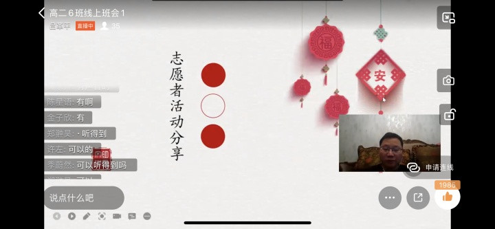 为了深入贯彻防疫需要,落实开学要求,加强家校班级师生联系,高二(2)班于2月12日晚上组织全体学生开展了线上班会课。此次班会主要分为上学期班级情况总结,寒假健康日报打卡情况反馈,学生寒假生活分享,开学报到防疫要求以及开学报到具体安排、相关事项提醒几个部分。