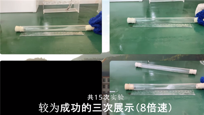 与许多精彩而美丽的展示实验不同,我们选择了验证氯化氢和氨气两种“恶臭”物质的气体扩散速率与相对分子质量关系的实验。用着全场最简单的器材,我们却对实验设计进行了许多次改进,从防止试剂挥发造成的环境污染,到滴入试剂时是否采用棉花缓冲吸收。实验现象也并不完全是预期中的烟环,而是类似于地理学中冷暖气团的锋面。然而我们并没有直接断定实验失败,而是对现象进行原因解释,知识迁移,然后确定实验指标,最后较为成功地验证了气体扩散速率与相对分子质量的关系,同时对于气体扩散的一些其他性质有了定性的认识。