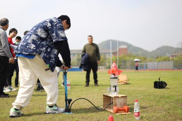 试飞后不断修改火箭设计是成功的基础,现场操纵更是成功发射的重中之重。水量调控、发射角度调整和箭头降落伞的检查缺一不可,不少实力强劲小组的火箭,完美地完成此前试飞,最后因为漏气、角度偏差、风向等小概率因素功亏一篑。有的小组,在火箭可能漏气的恐慌中加快了打气速率,技术指导李志祥老师忙提醒“保存体力,保持节奏”,均匀打气不仅可以保证成功率,也保证了安全。