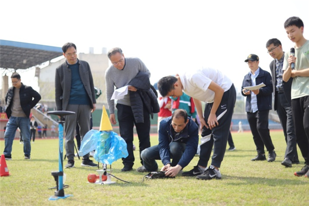 下午一点,录像、摄影者的长枪短炮早已架好。物理组老师们和志愿者分工合作,吴良娟老师带领志愿者检录、拍照,解学仁、杨琪荣两位老师和四位志愿者负责计时,李方标老师发布口令,实验室李志祥、陈钢、刘健三位实验老师提供后援技术支持,一切有条不紊地开展。在何乐晓老师的开场讲话后,比赛开始,每三组一批,三十个小组依次亮相发射。
