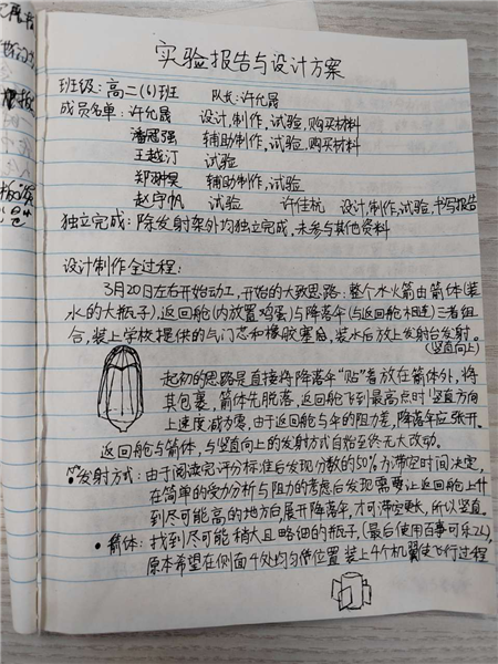 在活动中,我们逐渐接触到实验探究的过程,理论指导实践,学以致用,在实践中提高能力,感受从中收获的小乐趣,体会过程的艰辛——我们之前就从物理课本上学到他在近10年的电磁感应实验中,无数次失败却毫不气馁,1831年他终于发现电磁感应现象,永远改变了人类文明。产生想法再到制作并进行试验,从经验中总结改进方法并循环往复——虽然比科学家们的尝试简单太多,但大体过程应该相近。其中创新的想法与灵感是课堂与刷题中得不到的,对未来想走上科学研究道路的同学有很大意义。我们的物理吴良娟老师常常鼓励大家积极完成实验报告,把设计的想法与试验的结果较完整且有条理地记录下来。水火箭发射上天只是一时的,纸质报告却可以把这些成功“留住”,是自己有成就感之余把成功分享给他人,大家一起进步。
