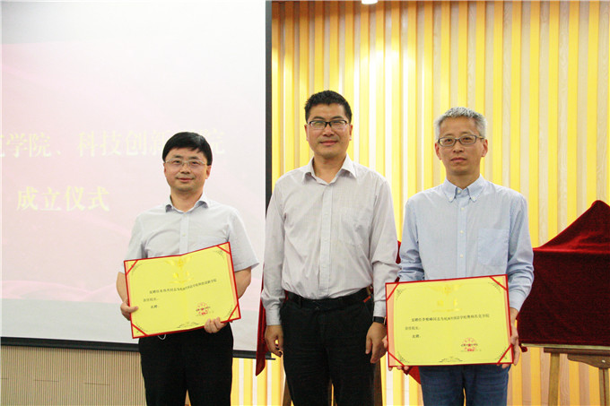 党委书记、校长王华琪为“两大学院”院长颁发聘书,并与两位院长一起为学院揭牌。“两大学院”院长李惟峰、朱伟杰分别就学院成立的背景和愿景作说明,并介绍了优秀的指导教师团队。两位院长指出,将在梳理总结现有工作的基础上,建强队伍,理顺机制,整合资源,彰显特色,推动学校学科竞赛和科技创新工作再上新台阶、取得新成效,致力于培养有家国情怀、有国际视野、有深厚素养的复合型预备英才。