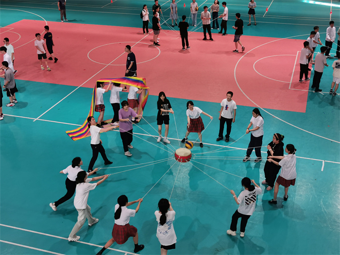 首先进行的是同心鼓活动。这一项目参加者10人为一组,每班有两组同学参加活动。每人握住绳子将鼓拉直,把一个排球放在鼓面上,大家一起尽可能多的创造颠球纪录。在活动开始前,同学们跃跃欲试,没想到真正练习时,这看似简单的颠球动作,在实际操作中可不容易。体育场内不仅球在飞,人的心和身体也与之一起舞动。每一次球与鼓的撞击,都似敲击在同学们的心头。刚开始大家只能颠球一两个,后来在慢慢的配合中找到了默契。“1、2、3、4……”,随着颠的球越来越多,大家发出了胜利的欢呼。