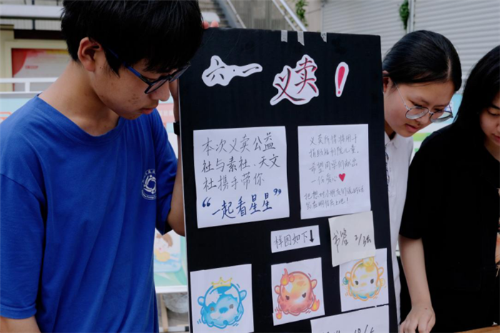 此次,我们联合天文社和素社举办了主题为“我们一起看星星”的六一爱心义卖活动。义卖于5月31日下午在超市门口举行,社员们摆出了前期准备好的星球挂件、明信片、书签等义卖商品,迎接同学们的到来。活动的受欢迎程度远远超出了我们原本的预期,原先准备的义卖产品在活动开始20分钟内就已经所剩无几。