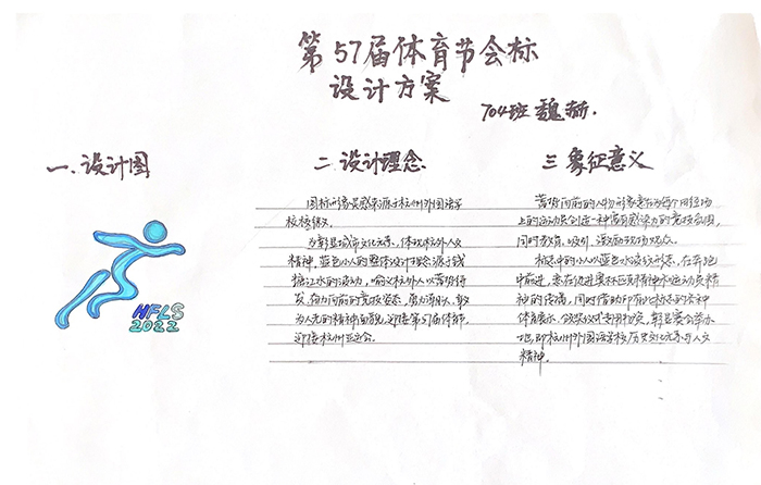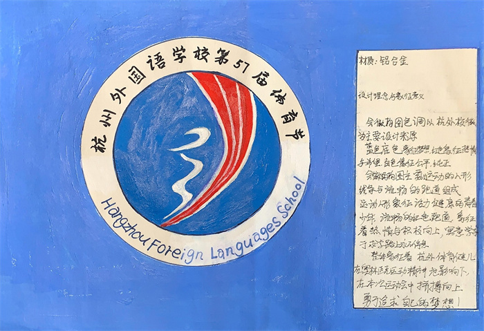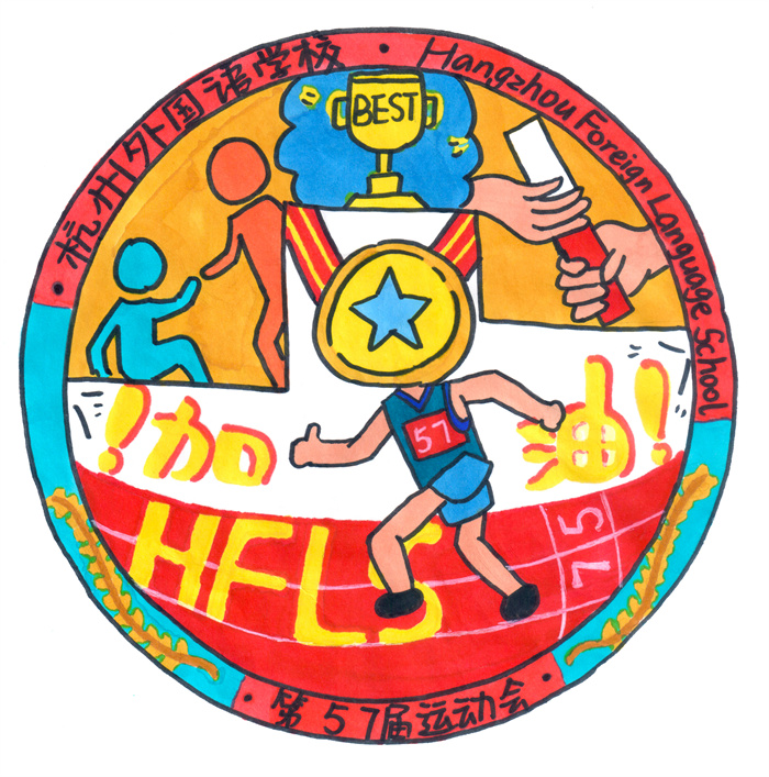 一等奖获得者李美沂同学有着新颖的设计理念。跑道位于会标的主要位置。“5、7”两个数字及参赛者号码牌 “57”,表示杭外第57届田径运动会。参赛者竖起的大拇指,意味着自我激励与同学鼓励相呼应。奖牌上的星星,寓意着新一届运动会的创新进步及其无穷新生力,更表现了所有参与者都是赛场上闪耀的明星。奖杯的设计亦有着同样的象征意义。左上角的蓝、橙两人以对比色填充,他们是对手,却相互扶持,表现了“友谊第一,比赛第二”的体育精神。右上角的接力棒传接,代表着责任与荣耀的传接,体现了团队合作的精神。