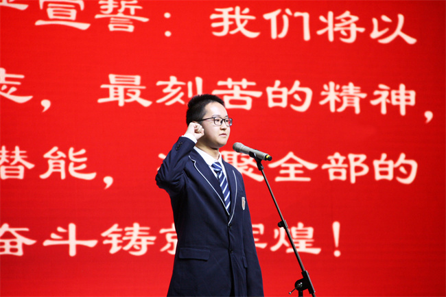 高考在即,高三年级金辰浩同学带领全体高考班同学进行宣誓。同学们举起右手宣誓,神情坚定庄重,响亮的口号体现他们拼搏奋斗的决心。