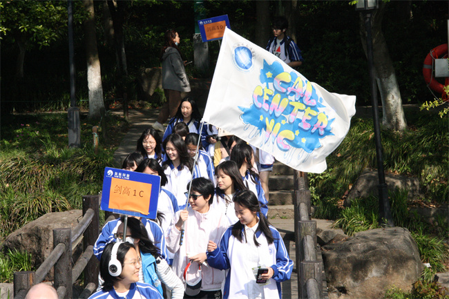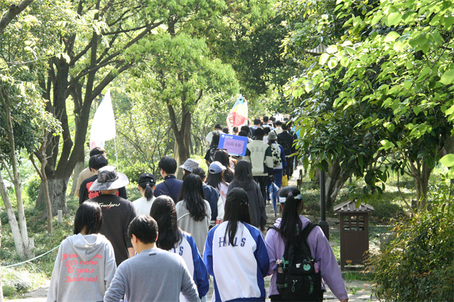 随着音乐,各班有序出发,彩旗随风飘扬,大家急切的心早已飞到了研学的目的地。经过40分钟的车程后,同学们到达了城山广场,开始了3公里的毅行活动。