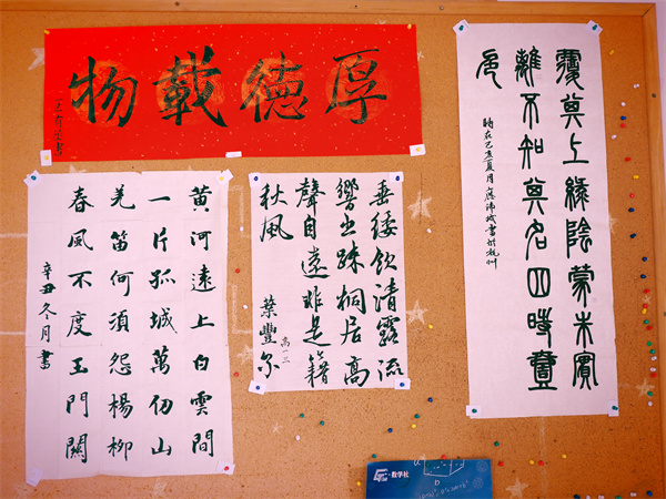 中华优秀传统文化的花朵在杭外已悄然盛放,书法作品主题展板为同学们带来高雅艺术,也为同学们在文化节中施展才华作下铺垫。而在未来的学期里,文化与艺术将会更加深入杭外人的心中,助杭外人养成深厚素养,也助艺术鉴赏蔚然成风。