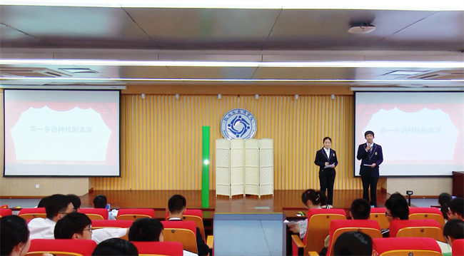 5月16日下午,高一年级多语种短剧表演活动在二号楼报告厅拉开帷幕。选修了二外的同学们经过细致的改编和紧锣密鼓的排练,终于将数部来自四个国家的经典作品搬上了舞台。