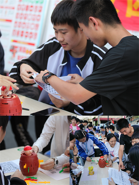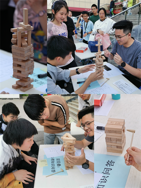 本次心理知识问答活动特别设计了“层层叠”小游戏。同学们需要从“层层叠”中抽取木块,而木块上写好了编号,回答对应编号的问题即可。创新之处在于,“层层叠”的存在消解了一部分同学们碰到试题的畏难心理,甚至不少同学“越战越勇”。现场也留下了同学们搭出来的各式各样的小木塔,趣意横生。虽然木块因堆积过高而倒塌,但现场的同学们还是给予了热烈的掌声。特意赶回来参加活动的第一届心理委员、高三大预班李博衍同学认为游园活动不仅让同学们在忙碌的课余生活中得到了放松,也给同学们带来了心理知识上的收获,可谓寓教于乐。