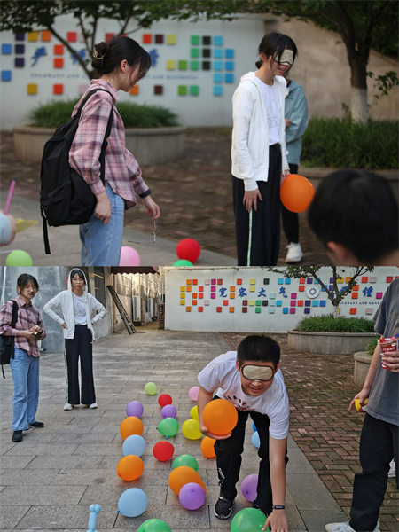 “蒙眼排雷”游戏需要指挥的同学和排雷的同学紧密配合,对默契和信任感有很高的要求。在活动中,不论是“蒙眼排雷”时踢到气球的惊异,还是完成任务的欢欣雀跃,以及因为紧张而左右不分带来的欢笑,都为原本两点一线的校园生活平添了几分乐趣,更是为原本沉浸在学习,考试焦虑中的大家排解了心中的忧愁。