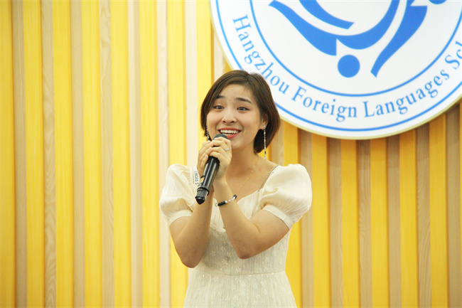 学生代表郑博元带来了小提琴独奏《维尼亚夫斯基d小调小提琴协奏曲第一乐章》选段。北京大学缅甸语系本科生、杭外优秀毕业生俞欣怡带来了德语歌曲《我只属于我自己》(选自音乐剧《伊丽莎白》)。