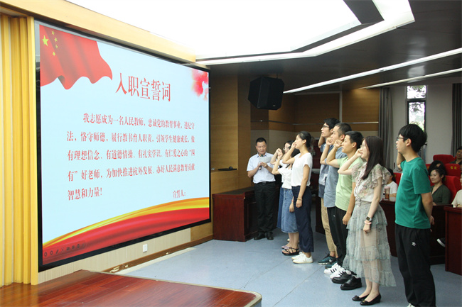 为帮助新教师快速成长,大会举行了新教师入职宣誓及拜师仪式,在校学术委员会委员、资深教师周美良老师的领誓下,新老师们满怀激情地宣读誓词,并分别向学科和班主任指导老师献花致敬。
