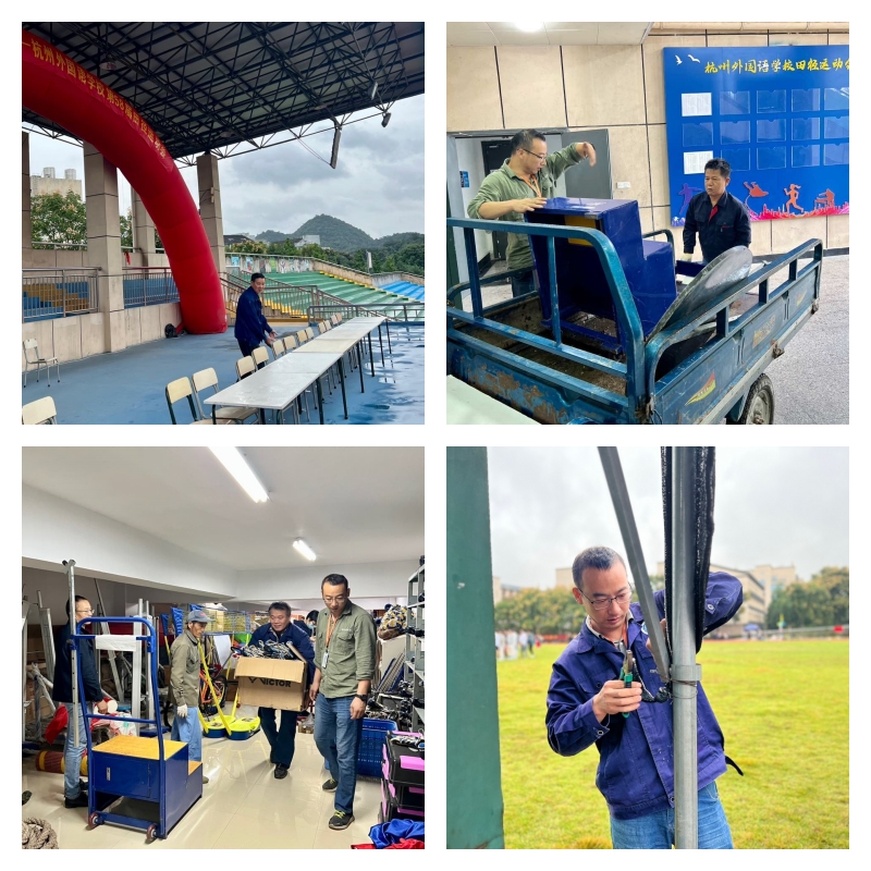 物管部门提前开展运动场地布置工作,放置计时台,架设遮阳棚,翻砂坑,放置跳高垫,搬走足球门,布置检录处、裁判处、发令处等各比赛场地;布置田径场主席台,架设充气拱门、悬挂横幅;搬运钉鞋、起跑器等运动用品;准备好课桌椅供学生使用。