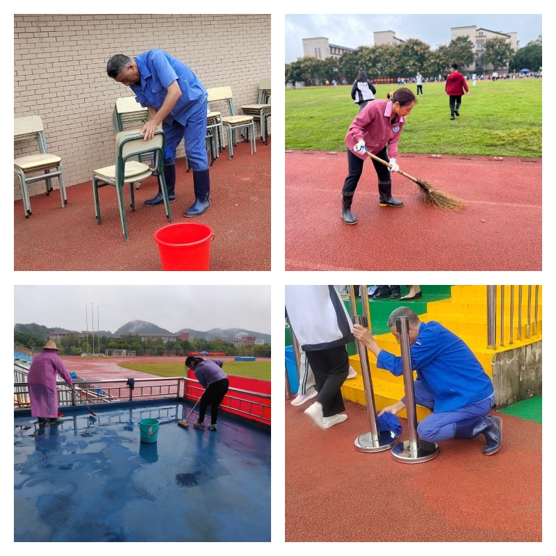 保洁部门紧随物管部之后,将物管部门准备好的桌椅和器材擦拭干净。这两天雨水不断,保洁部门在运动会当天提早开工,凌晨四五点就组织人员,对运动场地进行积水清理等工作,并在开幕式进行间隙,清扫场地积水,清理各种体育设施,确保同学们运动安全。