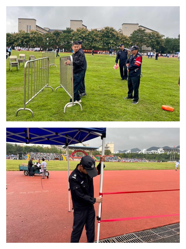 安保部门在运动会期间,按照需求调整校门管理方式,重新安排安保工作。用护栏设置学生就坐区域,做好场地管理工作。做好校园道路封闭管理工作,安排人员拉警戒线,进行定点、定人管理,做到人车分离,确保学生行路安全。做好运动场地周围安保工作,确保田径比赛期间,没有学生乱穿比赛场地,确保运动会赛程顺利。