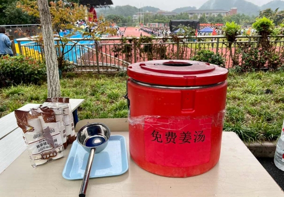 餐饮部根据运动会期间时间表,调整开餐时间,确保师生吃上热气腾腾的新鲜饭菜。运动会期间,气温骤降,餐饮部及时熬制浓浓的红糖姜汤,在田径场四周摆放好,供师生饮用,小小暖饮,浓浓关心。