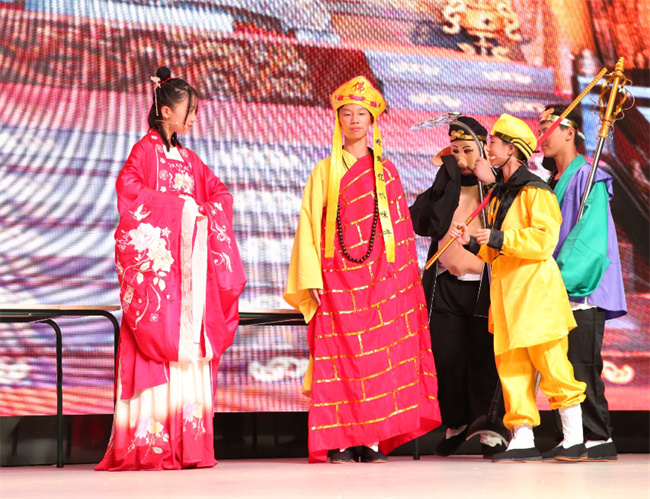 台上演员用精湛的演技,精心准备的道具与服装和声情并茂的演讲,将西游记中一幕幕经典的情节重现在学校的舞台之上。最有特色的是用相声演绎出生动的人物形象。台上相声演员你唱我和,互相配合,加上肢体语言,将孙悟空击败金银魔的细节展现得栩栩如生。