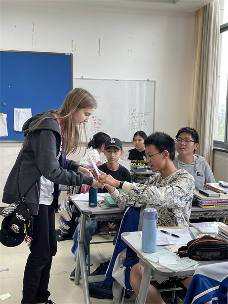 德国同学很乐意交流他们那边的文化,同学们也都竖起耳朵全神贯注地听讲,课堂氛围和谐而融洽,在自主交流环节有不少同学主动上前与外国友人交流,从文化、教育、科学、文学、艺术、体育等多方面展开讨论,尽显杭外学子的翩翩风度,厚实的文化基础以及扎实的英语底子。同学们在本次活动中,体验到了很多,学到了很多。同时这也有助于培养同学们的全球视野以及必备的交流能力,拓宽了圈子与眼界