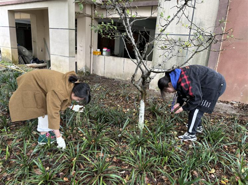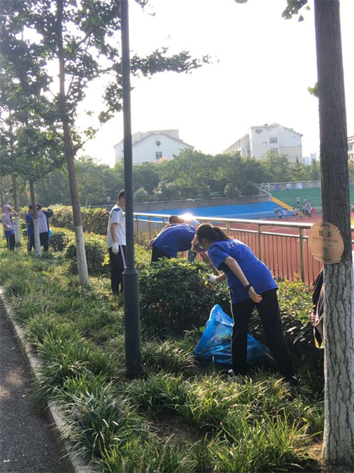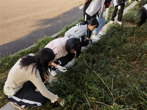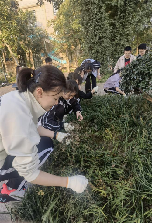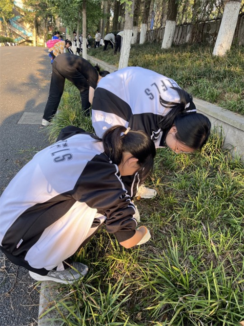 在后勤工作人员的指导下,同学们三人一群,五人一伙,在狭长的包干区散开,分工合作,有条不紊地在各自的区域忙碌起来。大家细心地分辨着绿地中的丝丝杂草,再用手三两下拔出。经过四十分钟的辛勤努力,包干区里的杂草被基本清除干净,校园的绿意愈发浓厚。
