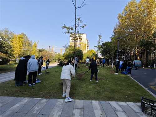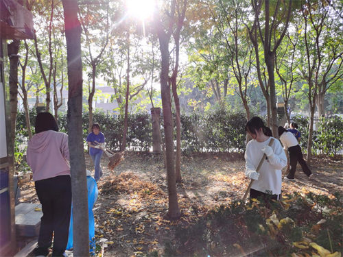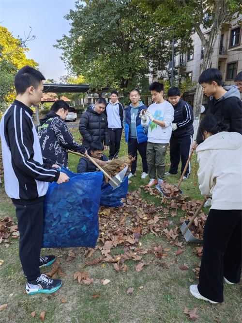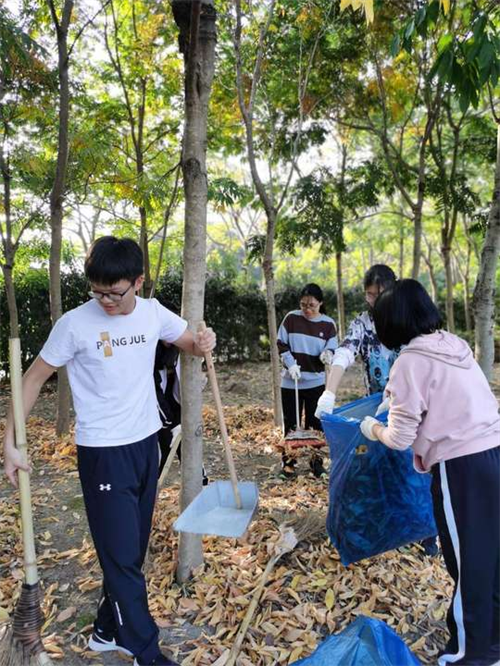 分配好扫帚、耙子、畚斗等劳动工具后,同学们开始了劳动。三五个同学自成一组,配合着将成堆的落叶装进垃圾袋,不久便娴熟了起来。在大家的共同努力下,一片绿化带迅速变得清爽整洁。