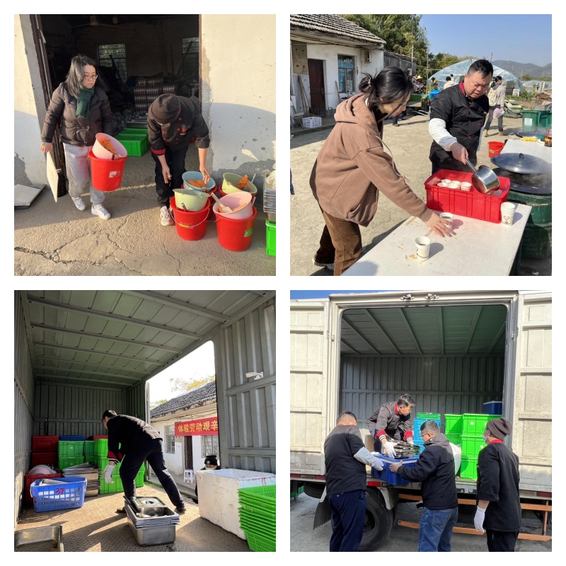 学农当天,后勤公司带班工作人员先于师生大部队到达农场,开展场地巡视,明确各班任务分配和时间节点,核对流程,明确各工作人员岗位职责。学生本次学农一个班人员分为两组,一组为烹饪队,一组为劳动队,劳动内容和场地,需后勤人员带领进行,进行技术指导,并控制时间,进行更换场地和劳动内容,劳动内容有清理杂草垦荒、收获冬瓜并整理冬瓜地、挖番薯、收割水稻、干塘捕鱼等。餐饮部提前做好学生食材和烹饪工具的准备工作,如保温箱、各种调料、工具、餐具、食材等,整理分装好后供烹饪组同学领取,并在事后做好工具和餐具的回收工作;餐饮部派工作人员到农场,利用土灶烹饪,为当天现场七十余名教工提供午餐保障。因为学生需要进行干塘捕鱼,天气寒冷,餐饮部在现场熬制浓浓的红糖姜汤,提供给同学们驱寒。