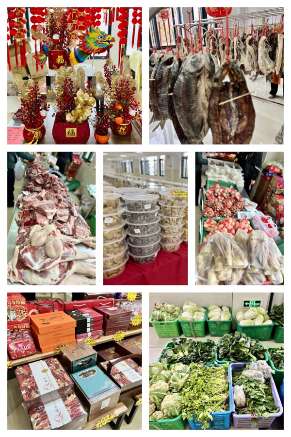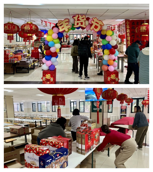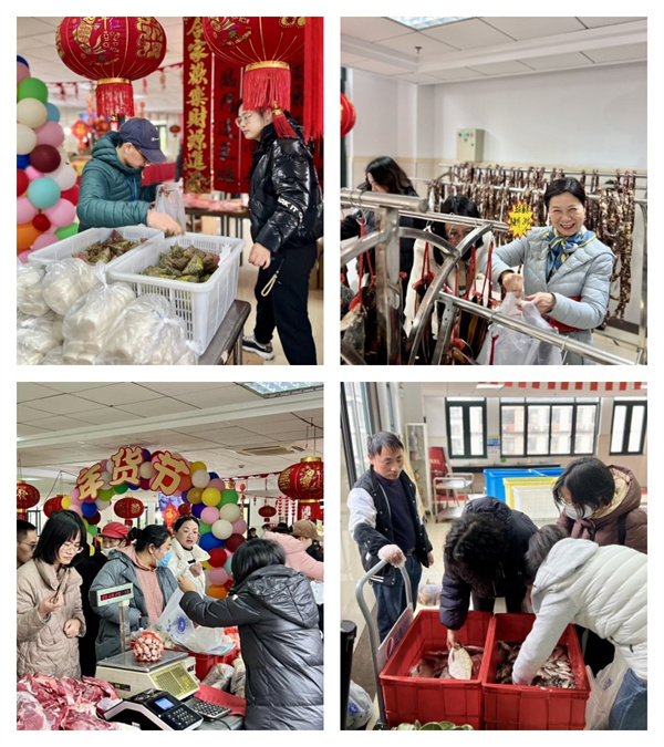 年货节上,产品丰富多样,日常所需的粮油米面、新鲜水果、冻货自然是有一席之地,也有适合走亲访友的各色零食礼盒;手作农家冻米糕等土特产,是年节居家零嘴;还有过年氛围担当各种年画、春联、年宵花福桶等装饰品,红包和有龙年元素的手工礼盒受到欢迎;也有后勤特色,农场的无公害新鲜蔬菜,农场当天干塘捕捞起来的鱼;新鲜牛羊肉;年货节上最闹忙的就是中央厨房自制的酱肉、香肠、酱鱼干、咸肉等腌制品区域,精选原料,用心制作,保证了稳定安心的出品,受到教职工一致好评。