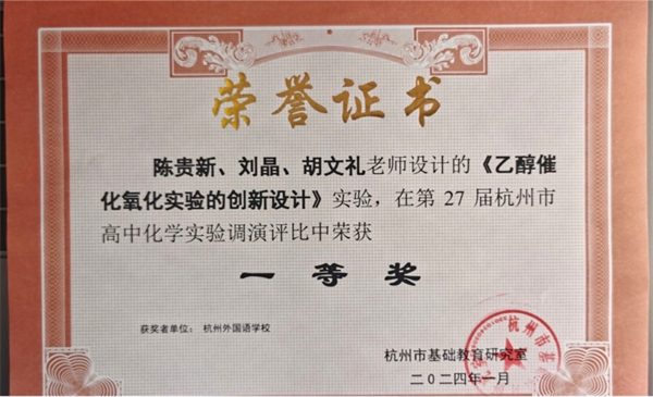 2024年1月11日,为落实化学学科核心素养,提升教师教研能力,杭州市基础教育研究室搭建实验交流平台,在杭州第二中学钱江学校举行了杭州市第27届化学实验调演活动。我校陈贵新、刘晶、胡文礼三位老师参赛,展示了“乙醇催化氧化实验的创新设计”,斩获一等奖!