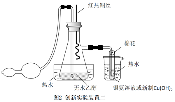 本次大赛,三位老师针对“乙醇催化氧化”课本实验的以下不足之处:(1)未对乙醇的氧化产物乙醛做有效检验。通过闻气味的方法确定生成物是乙醛说服力不够强,无水乙醇的挥发会对乙醛的确定造成干扰;(2)乙醇(气体)的催化氧化反应是一个放热反应,课本实验中并未体现。结合课堂实践探索,三位老师创造性地设计了以下两个实验装置。实验1:首先将铜丝在火焰上灼烧,生成黑色的氧化铜。接着,将红热的铜丝伸入装有热酒精的锥形瓶中(铜丝未接触酒精液体,与酒精蒸气反应),铜丝由黑变红,即氧化铜被乙醇还原为铜单质,再将铜丝抽出至锥形瓶口,铜丝变黑,且继续红热,说明乙醇的催化氧化为放热反应。重复多次,铜丝出现黑、红交替变化。另外,为充分证明反应生成乙醛,将蘸有希夫试剂的试纸条靠近锥形瓶口,纸条变红,证明了乙醛的生成。实验2:将红热的铜丝插入锥形瓶中,塞紧塞子,用双球打气筒缓缓鼓入空气,可看到吸滤瓶中的铜丝不断进行红、黑交替变换,试管中新制的氢氧化铜溶液慢慢变黄绿色,加热后产生砖红色沉淀;若换成水浴加热的银氨溶液,可观察到光亮的银镜。