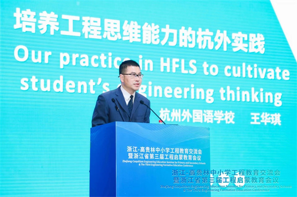党委书记、校长王华琪作为浙江学校代表,介绍了培养工程思维能力的杭外实践。王校长从校园里发生的三个故事谈起对工程思维的认知,他认为学生工程思维的培养是融合到科学、技术甚至人文学科中。它需要培养学生的想象力和对生活的热爱,给学生自由探索实践的时间和空间,学生会以工程思维链接社会,在科研和商业领域茁壮成长,像杭外知名校友黄峥、汪韬和沈亦晨都是有工程师背景的企业家。