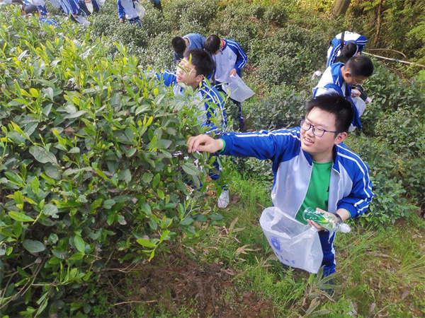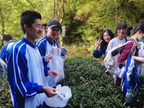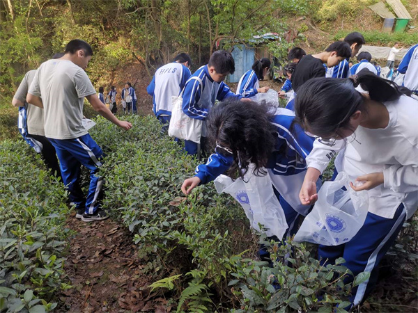 这次的实践主题是“采茶叶”。同学们在半身高的茶树间穿梭,指尖摩挲着树叶,努力辨认着“茶叶”的模样,一边采摘一边体验茶农的辛劳。这是一次大家在繁忙的学习之余不可多得的亲近自然的机会。