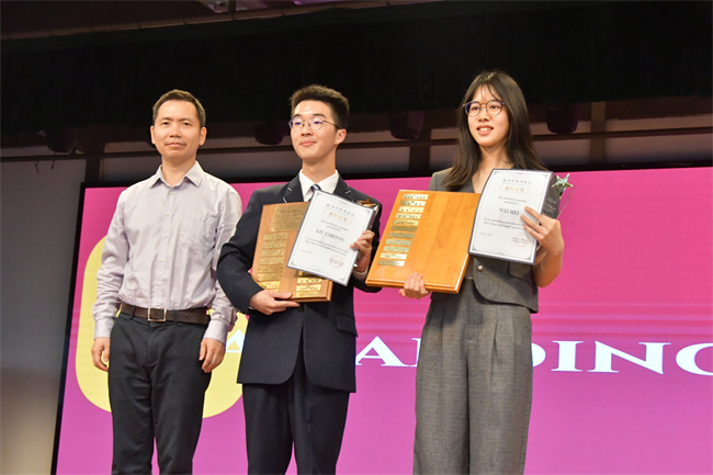 最终,韦美和刘宸聿分别夺得2024“周恩来杯”英语演讲比赛女生组和男生组的冠军,李力副校长为他们颁奖。