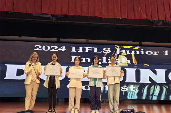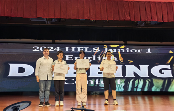 We’re glad to win this prize. Dubbing is team work. We couldn’t do this without our teammates. Nancy bought the dolls of Spongebob and other characters. Kevin Guo watched countless episodes of the cartoon series to look for the appropriate part. Kevin Zhang, Amber and Lucas shared many dubbing skills, which made the process easier. Getting this prize takes us back to the time when we were actively practicing. We spent as much spare time as possible practising together. We would imitate the characters’ voices and try to synchronize with them. Although it was tiring, we enjoyed it very much! We’d like to express our deepest gratitude to our passionate teacher, Ms. Wang. She gave us precious suggestions on how to make our dubbing better, and she designed the sound effects which became the highlight of our show. If it weren’t for her, we couldn’t win the prize today. All in all, our efforts and Ms. Wang’s encouragement took us where we are today.