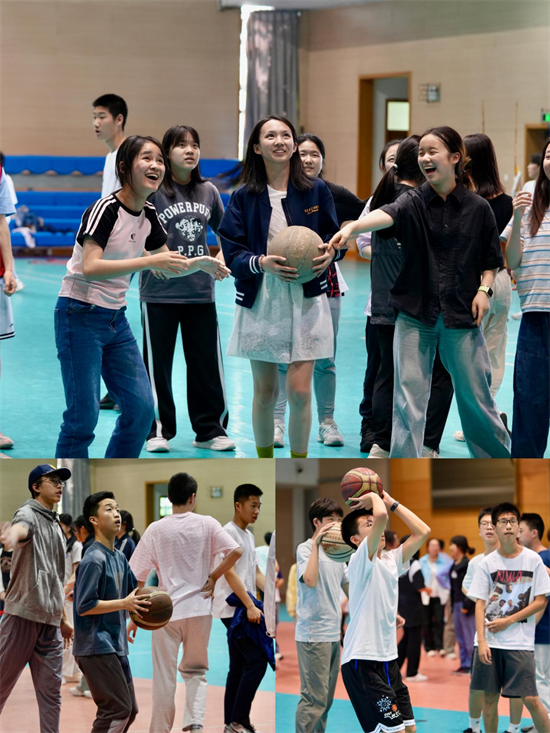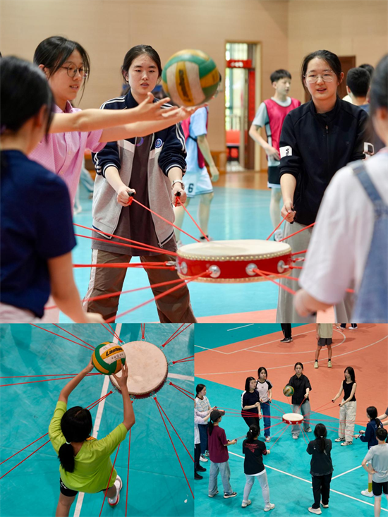 这场生动、有趣的活动分为投篮比赛和同心鼓大作战两个项目,以班级为单位进行竞赛。既为集体竞赛,那就人人要参与,每个同学投篮或同心击鼓的动作,都得到了整个集体的关注和帮助;偶然的失误,也得到同学积极的鼓励和安慰。每一次的成功,都得到大家的欢呼和喝彩。四个班的同学你追我赶,在紧张、欢快的氛围中度过了一个下午。