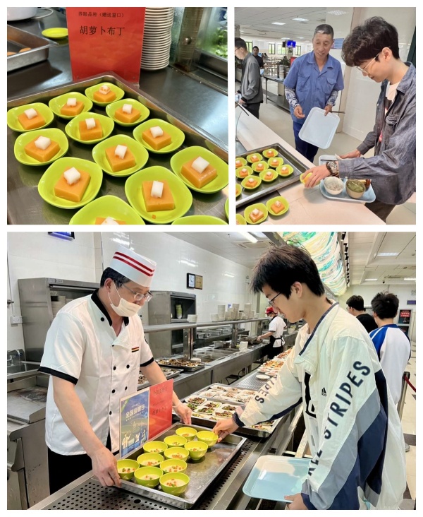 餐饮部结合本次主题,在食堂张贴宣传海报,告诉同学们吃什么食物可以提供保护眼睛的营养素,提倡科学健康饮食。宣传的同时餐饮部以身作则,在中午为师生提供爱眼日限定胡萝卜布丁,免费请师生品尝,面点师的手充满魔力,将很多同学不爱吃的胡萝卜融入布丁后得到师生好评。