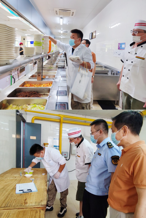 6月18日中午,西湖区市场监督管理局来访我校,对食堂开展突击抽检,主要针对餐具清洗卫生情况。市场监管工作人员利用试剂进行表面清洁度快速检测,检测结果我校食堂餐具卫生洁净,符合要求。