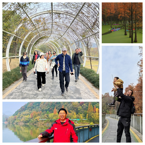 沿着青山湖徒步,在湖光山色中,大家三五成群,或漫步湖边,或驻足拍照,欣赏着沿途的自然风光,感受着深秋的气息。湖边的栈道上不时传来大家的欢声笑语,教职工们在大自然的怀抱中,尽情享受这份宁静与和谐。