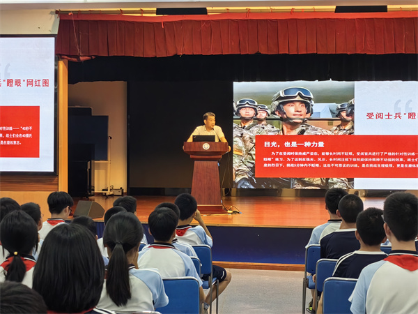 在“从武器装备看使命”这一章节,罗校长向同学们介绍了大阅兵中所展示的我国部分先进的军事装备,激发了同学们的自豪感。他指出,强大的“中国速度”不仅是科技实力的体现,更是自主创新与民族志气的象征。同学们也深切感受到新时代赋予青少年的使命与责任。