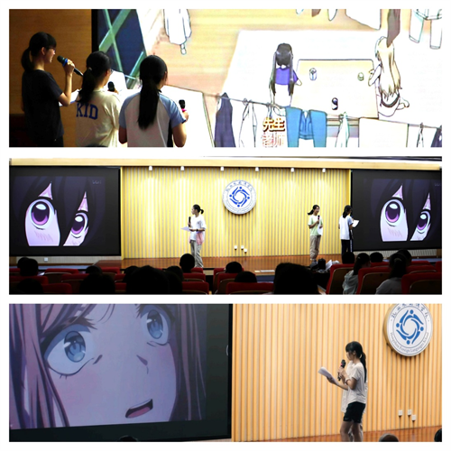 活动现场,同学们以高涨的热情投入这场语言盛宴。日语班同学率先登场,《铃芽之旅》主题曲的空灵旋律与《假面骑士》的激昂节奏交相辉映,瞬间点燃全场气氛。《鬼灭之刃》《南家三姐妹》和《迷途之子》的配音表演更是精彩绝伦,同学们精准捕捉角色情感,将日语的细腻表达展现得淋漓尽致。