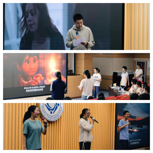 西语班的表演洋溢着伊比利亚半岛的热情。《如果你》的旋律悠扬动人,《疯狂动物城》《冰雪奇缘》和《寻梦环游记》的配音更是将活动推向高潮。同学们妙趣横生的角色演绎配合流畅发音与饱满情感,仿佛为表演注入了弗拉门戈的灵魂,诠释了热情奔放的西语风情。