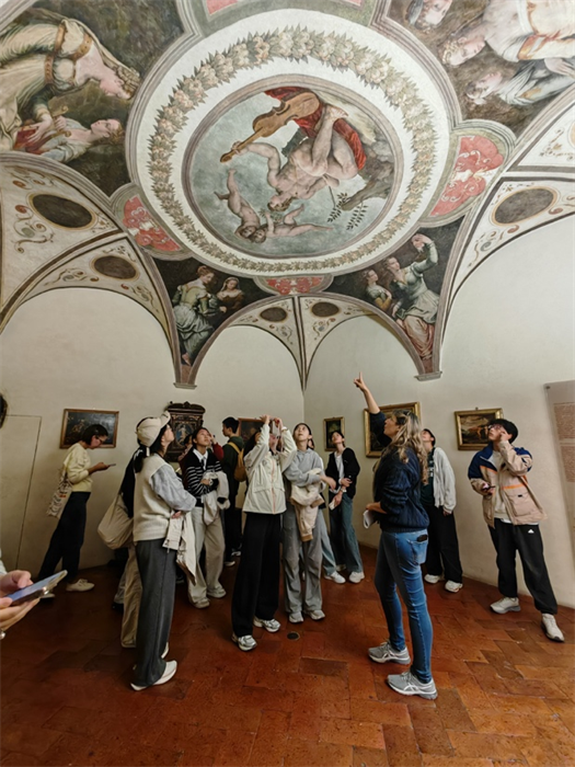 上午,同学们分组进入Redi学校的日常课堂,深入体验当地的上课方式,课堂上自由开放的氛围、鼓励思辨与讨论的教学方式,以及师生们毫无保留的热情,都给同学们留下了深刻的印象。随后,师生们共同参观了阿雷佐的圣方济各圣殿与艺术家瓦萨里故居博物馆。圣殿的壮观,瓦萨里作品的精美,都让大家惊叹不已。这也像是一堂行走的历史课,书本上文艺复兴时期的知识点与眼前的艺术真迹、建筑实体相互印证,让学习变得尤为生动。