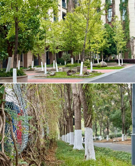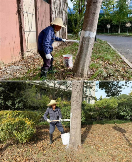 虽已过立冬,杭城气温仍持续偏高。面对今年入秋晚、暑热时间长的异常气候,后勤物管绿化部抢抓晴好天气,全面启动校园树木冬季养护工作,为校园内的树木精心涂上“防护衣”,助力它们安然度过即将到来的寒冬。