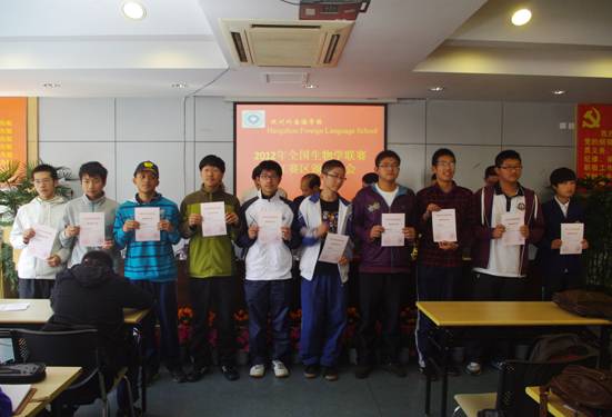 114,由浙江省动物学会、浙江省植物学会共同主办的2012年全国中学生生物学联赛(浙江赛区)颁奖大会在我校隆重举行。省动物学会理事长、省生物竞赛委员会主任丁平教授,省植物学会理事长、省生物竞赛委员会主任傅承新教授浙江大学生命科学学院副院长杨卫军教授,杭州外国语学校副校长吴锋刃,省科协青少年活动中心龚剑等出席了颁奖大会,并为获奖选手和团体颁奖。
