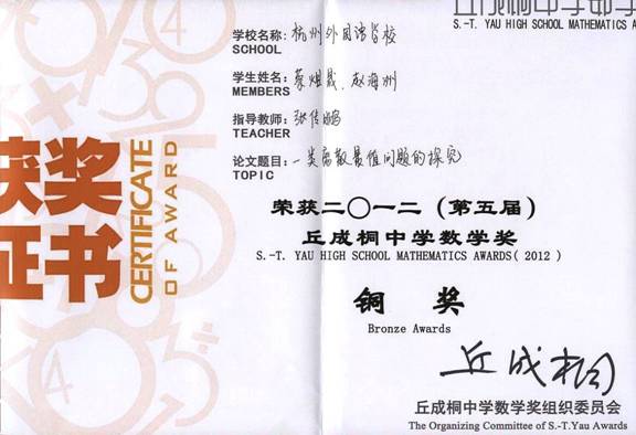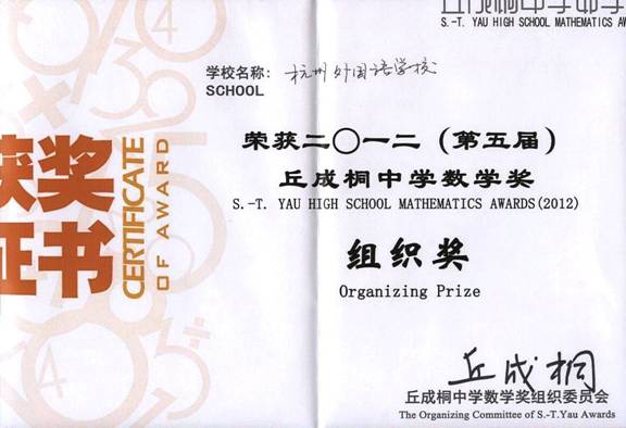 历年来,我校学生积极参与此项国际赛事,且都取得了非常突出的成绩:2008年,傅雨迪、李周佳获首届丘成桐中学数学奖铜奖;2010年,朱陶元敏、张允宜获首届丘成桐应用数学奖金奖;2011年,杨嘉旗、徐天辰、李晨杨获丘成桐应用数学奖铜奖。