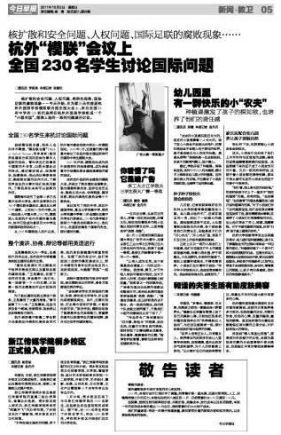 听着陈佳嘴里蹦出的一个个国际时事新名词,记者一时都有点转不过弯来:“为组织和参加模联大会,你们平时国际新闻没少看吧?”“也不能说是为了参加模联大会去关心国际时事,两者是相辅相成的。我觉得这样的活动能促进我们高中生的课外阅读,关注与思考国际时事,从而学到课本以外的知识。我们模联的指导老师不仅有教英文的,也有教政治历史和地理的,对每位与会代表来说,大会考验的是综合素质。”